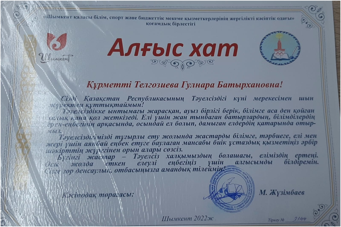 «Өрлеу» БАҰО АҚ филиалы Түркістан облысы және Шымкент қаласы бойынша кәсіби даму институтынан:Мемлекетіміздің рухани әлеуетін рығайту мен білім бері сапасын арттыру саясатын жүзеге кәсіби жаіашылдықғы,үздіксіз іздемпаздықты және жоғары нәтижелері үшін мадақтама.Тіркеу №5720
