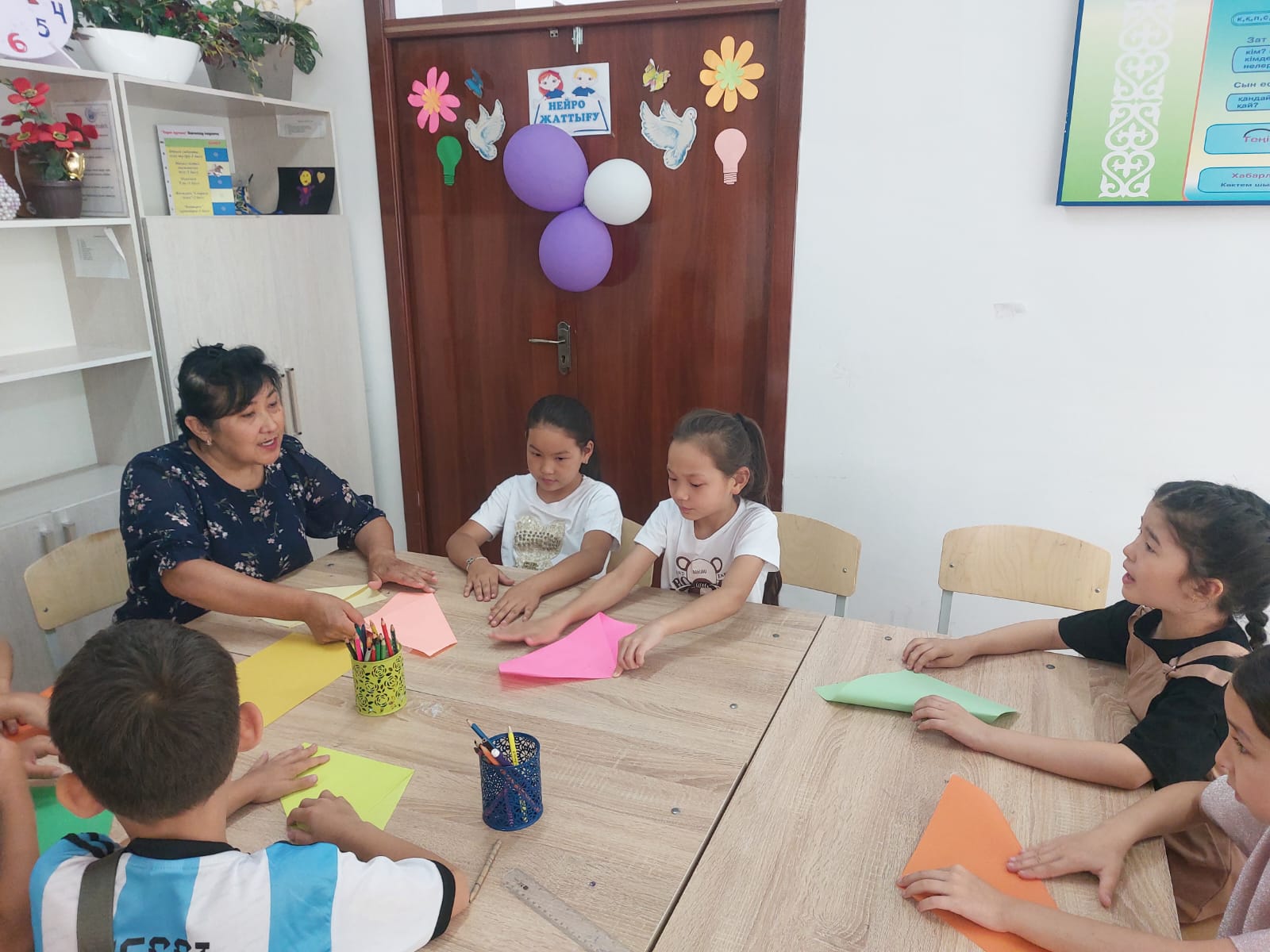 Күншуақ тобындағы оқушылар өздері түрлі-түсті қағаздан көзілдірік жасап, қуанып көздеріне тағып көріп бір-бірінмен қуанып қалды.